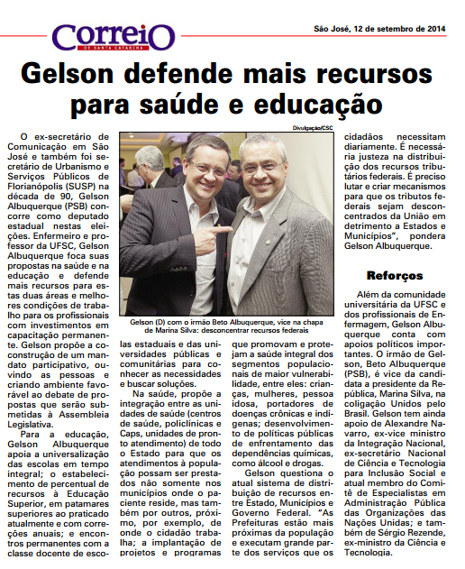 A publicação, que circula na região metropolitana de Florianópolis, ressaltou ainda os importantes apoios que o Enfermeiro e professor Gelson Albuquerque vem recebendo, a exemplo dos profissionais de Enfermagem e da comunidade universitária da UFSC. Gelson é irmão de Beto Albuquerque, vice de Marina Silva nestas eleições presidenciais. Também são reforços da candidatura de Gelson no Estado: Alexandre Navarro, Ex-Vice Ministro da Integração Nacional, Ex-Secretário Nacional de Ciência e Tecnologia para Inclusão Social e atual membro do Comitê de Especialistas em Administração Pública das Organizações das Nações Unidas; e Sergio Rezende, Ex-ministro de Estado da Ciência e Tecnologia.